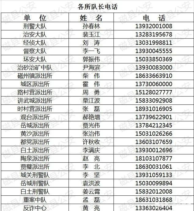 畅通警民渠道!邯郸一县公安局长、所队长的邯郸手机号码全公开